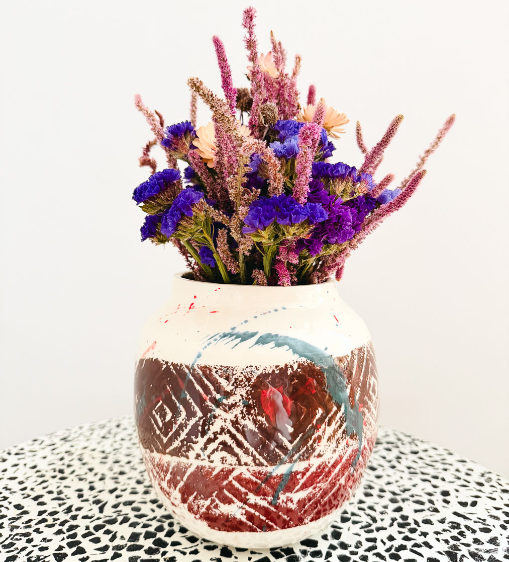Handgefertigte Keramikvase aus Nizza, Frankreich. Gefertigt in der traditionellen Terres Vernissées-Technik, die typisch für die Region Vallauris an der Côte d’Azur ist.